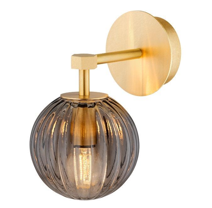 Złoty ryflowany kinkiet w stylu Art Deco z dymioną szklaną kulą Paloma