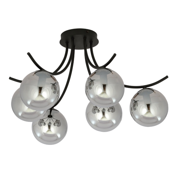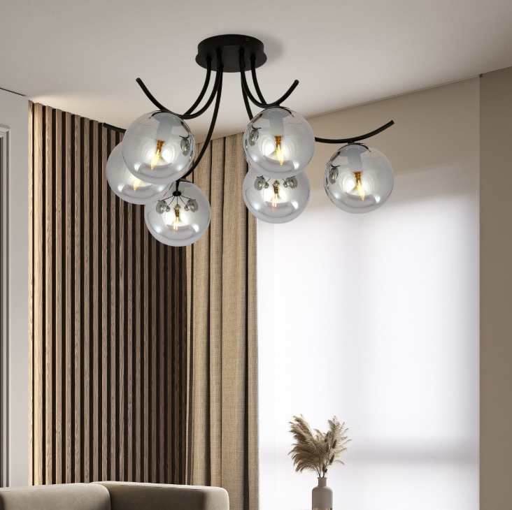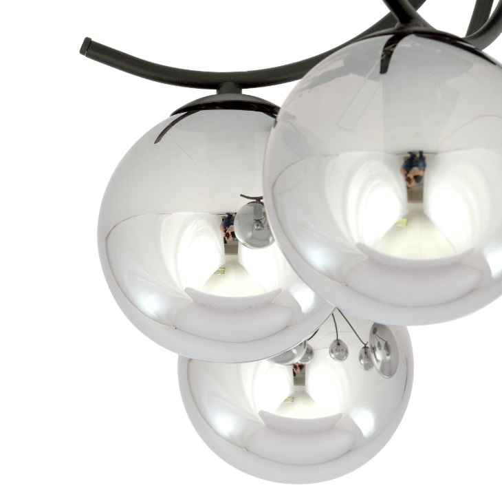 Konstrukcja oprawy to przemyślane połączenie formy i funkcji. Każda z sześciu szklanych kul o średnicy 15 cm mieści źródło światła E14 o mocy do 10W, co w sumie daje możliwość uzyskania nawet 60W oświetlenia - wystarczająco, by rozświetlić salon o powierzchni 25-30 m². Czarne, matowe wykończenie metalowych ramion pięknie kontrastuje z lustrzanym połyskiem srebrnych kul, tworząc kompozycję, która pasuje zarówno do wnętrz nowoczesnych, jak i tych w stylu glamour czy art deco.