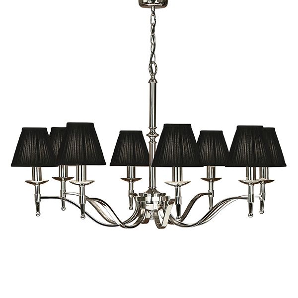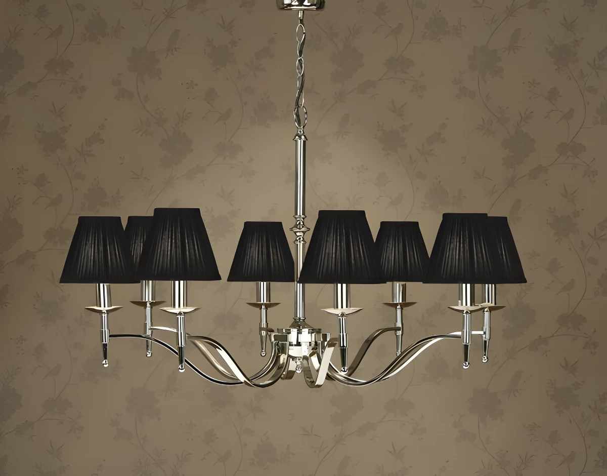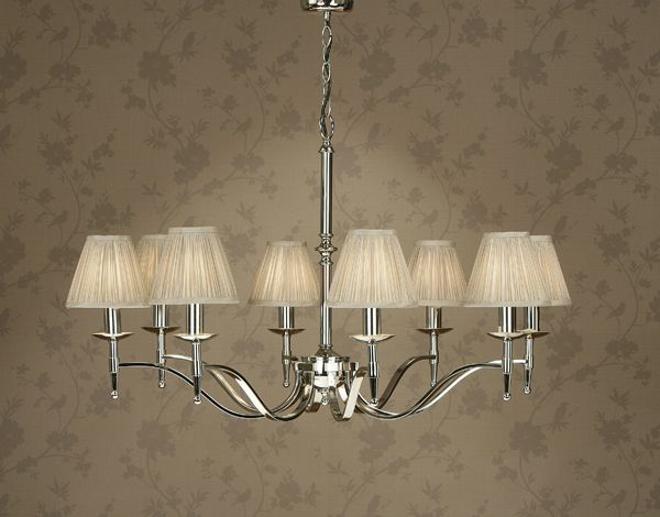 Duży srebrny żyrandol do eleganckiego salonu w stylu klasycznym lub modern classic. Żyrandol sprzedawany bez abażurów - zadzwoń do naszego sklepu przed zakupem. Wiele kolorów abażurów do wyboru.