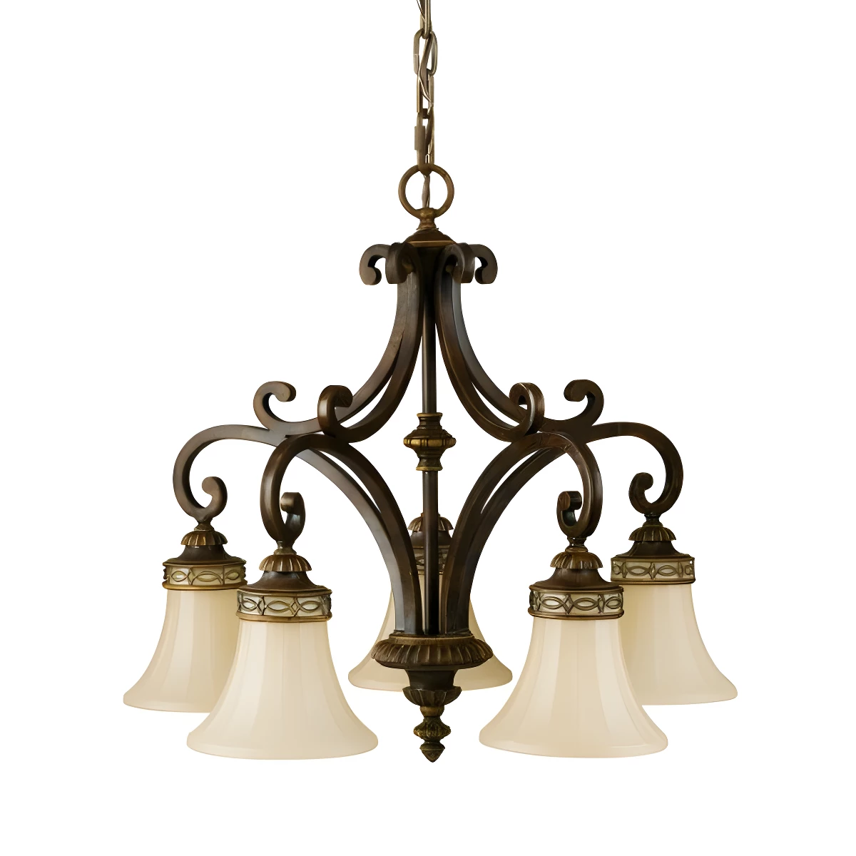 Rzadko spotykany przykład żyrandola do takich pomieszczeń jak kuchnia, salon - od znanego producenta Ardant Decor. Charakterystyka lampy: numer katalogowy FE/DRAWING RM5, wykonanie - antyczny brąz, szklane klosze, dodatkowe informacje - klasyczny, szklane, typ trzonka żarówki E27, moc 60 W.