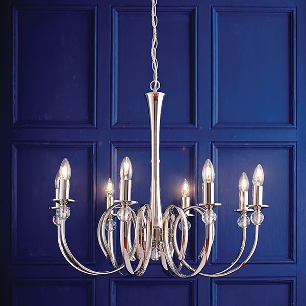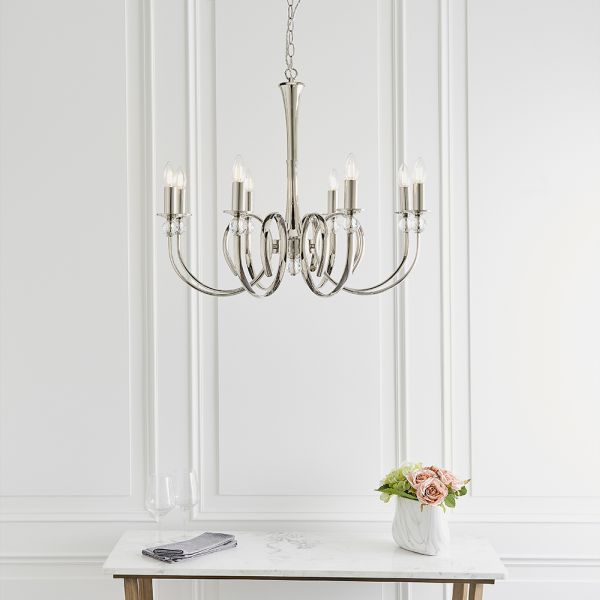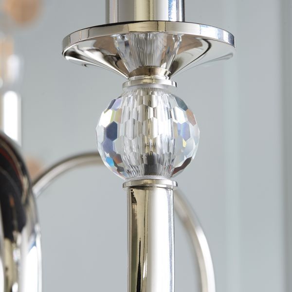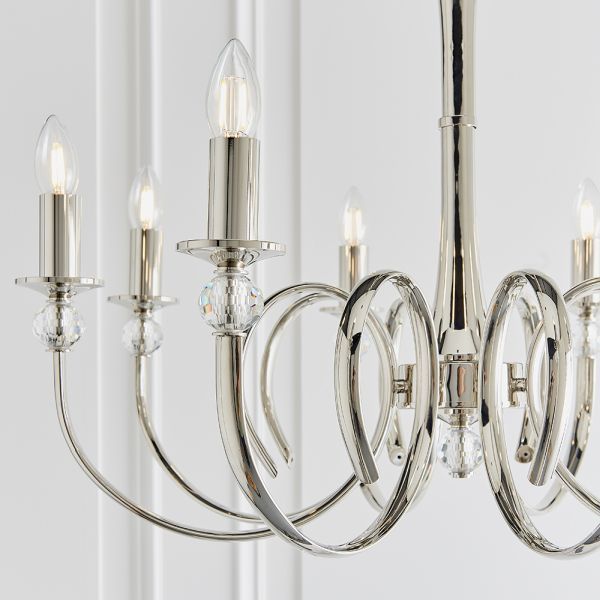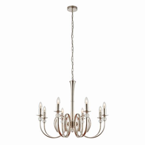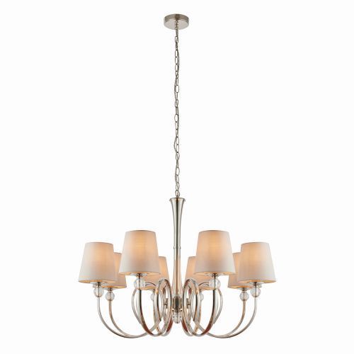 Przepiękny żyrandol Fabia na 8 żarówek to doskonała propozycja do przestronnych pomieszczeń. Zdobione, srebrne ramiona doskonale prezentują się z abażurami, ale jeśli wybierzesz żarówki dekoracyjne, abażur nie będzie potrzebny.