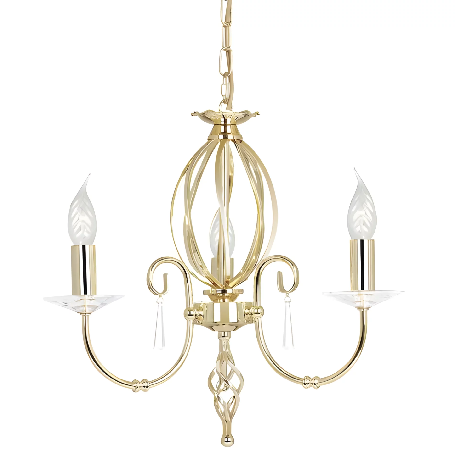 Elegancki żyrandol Grace posiada miejsce na trzy żarówki, dlatego doskonale doświetli romantyczną sypialnię. Niesamowity charakter żyrandola podkreślają kryształowe podstawy pod oprawki żarówek i złota zawieszka w centralnym punkcie.