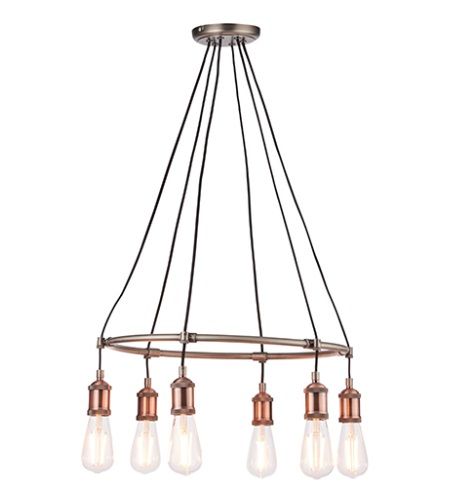 Oryginalny egzemplarz żyrandola do takich pomieszczeń jak salon - od znanego producenta Endon. Charakterystyka lampy: numer katalogowy 76337, wykonanie - antyczna cyna, antyczna miedź, dodatkowe informacje - industrialny, typ trzonka żarówki E27, moc 40 W.