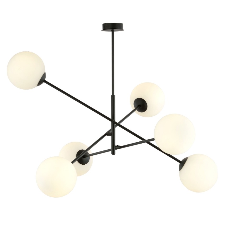 Linear 6 czarny żyrandol z sześcioma opalowymi kulami do jadalni i salonu