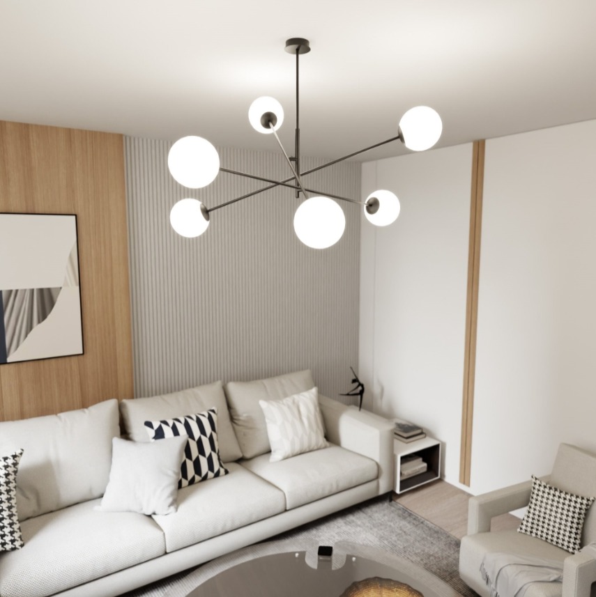 Sześć mlecznych kul przełamuje monotonię płaskiego sufitu. Czarne, matowe ramiona rozchodzą się promieniście od centralnej podsufitki, a każda z opalowych kul o średnicy 15 cm nadaje całości lekkości i nowoczesnego charakteru. Asymetryczna konstrukcja sprawia, że żyrandol wygląda inaczej z każdej perspektywy. W jadalni nad stołem dla 6-8 osób Linear 6 zapewni równomierne oświetlenie całej powierzchni blatu. Rozproszona struktura z sześcioma źródłami światła eliminuje problem jednego centralnego punktu, który zostawia cienie w rogach stołu.Zapytaj o ten produkt
