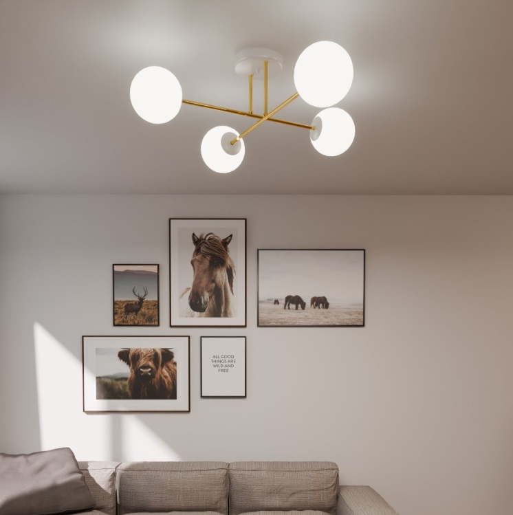 - Cztery opalizujące kule świetlne tworzą harmonijny układ krzyżowy, który równomiernie rozprowadza światło po całym pomieszczeniu