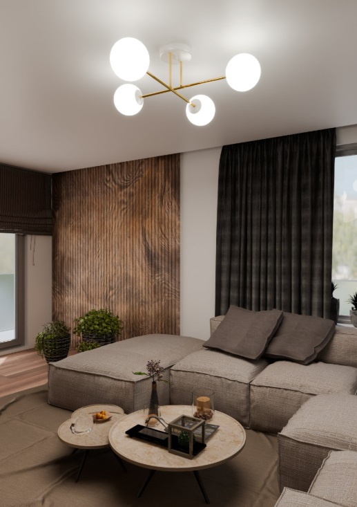 - Złote ramiona o geometrycznym układzie dodają wnętrzu luksusowego charakteru bez przytłaczania przestrzeni