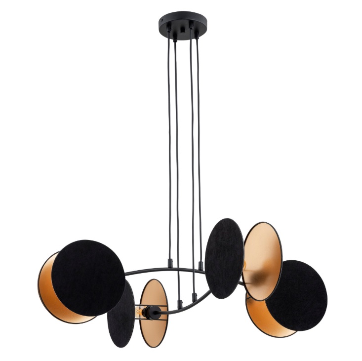Żyrandol Motif 4 to prawdziwe dzieło sztuki oświetleniowej. Jego okrągłe dyski w matowej czerni z błyszczącymi złotymi wnętrzami tworzą hipnotyzującą grę kontrastów. Dotykając gładkiej powierzchni metalu, czujesz solidność wykonania, a asymetryczne rozmieszczenie kloszy na różnych wysokościach nadaje całości dynamiki i lekkości. To nie jest zwykła lampa - to rzeźba świetlna, która przykuwa wzrok nawet gdy jest wyłączona.